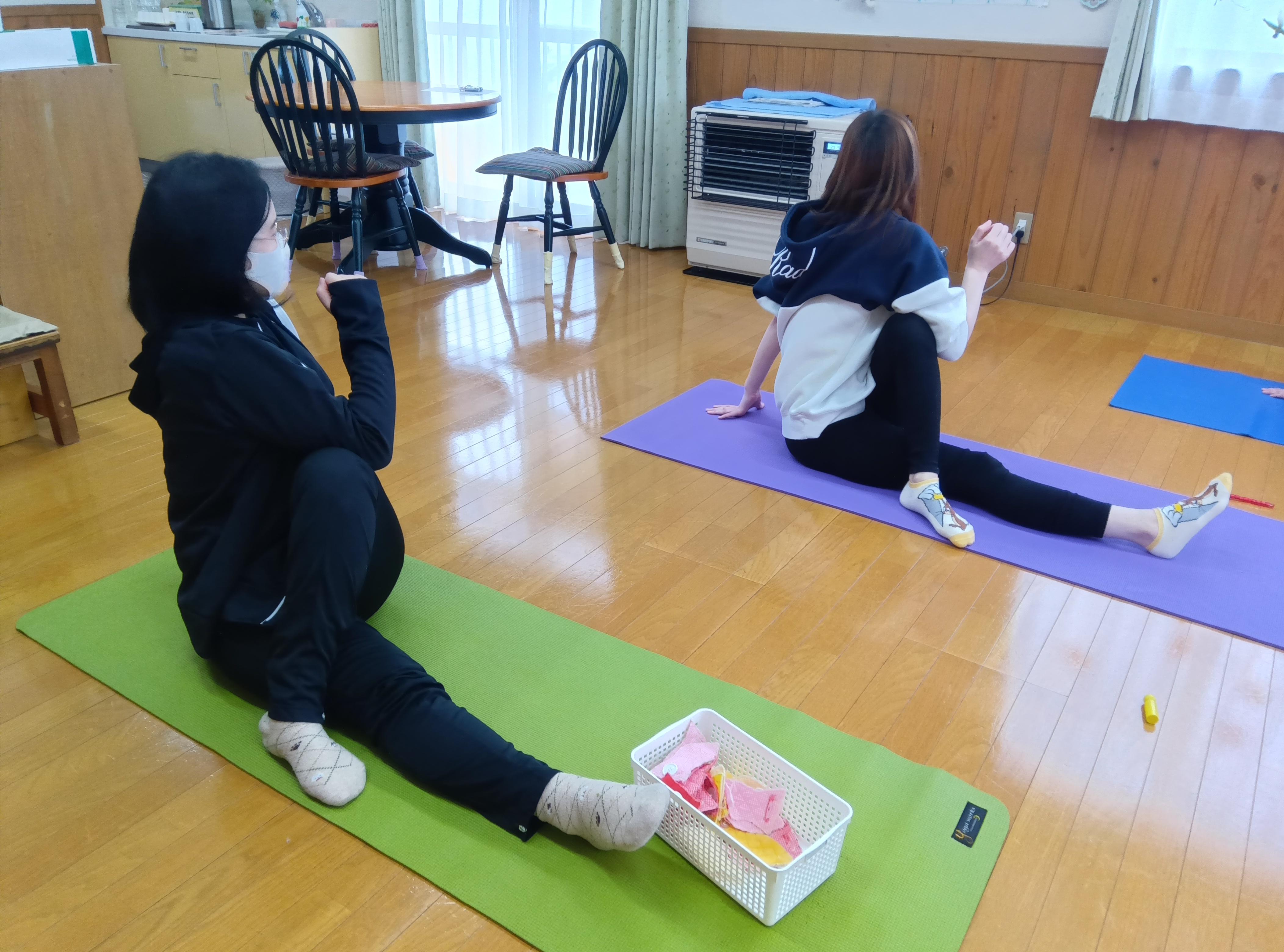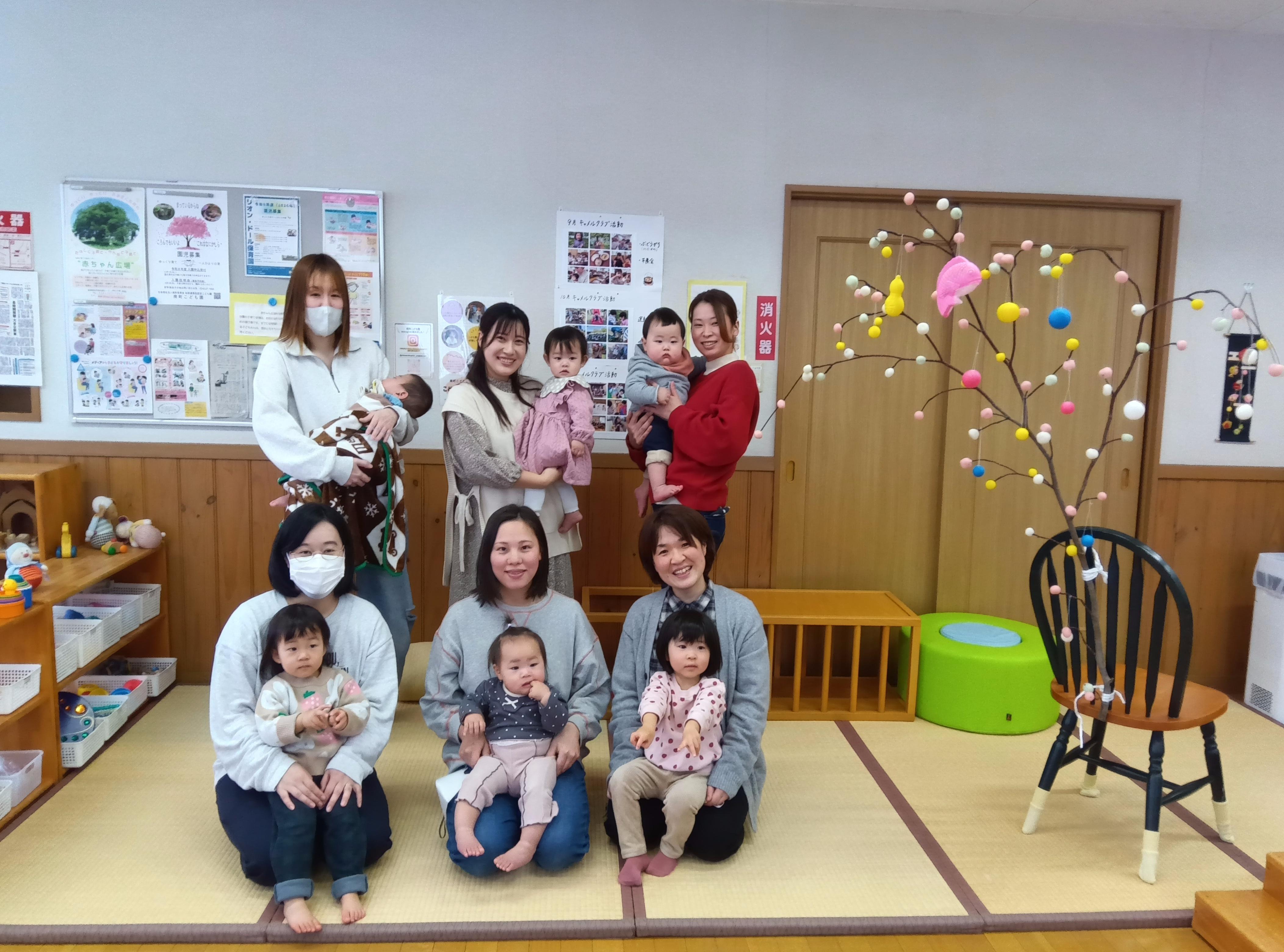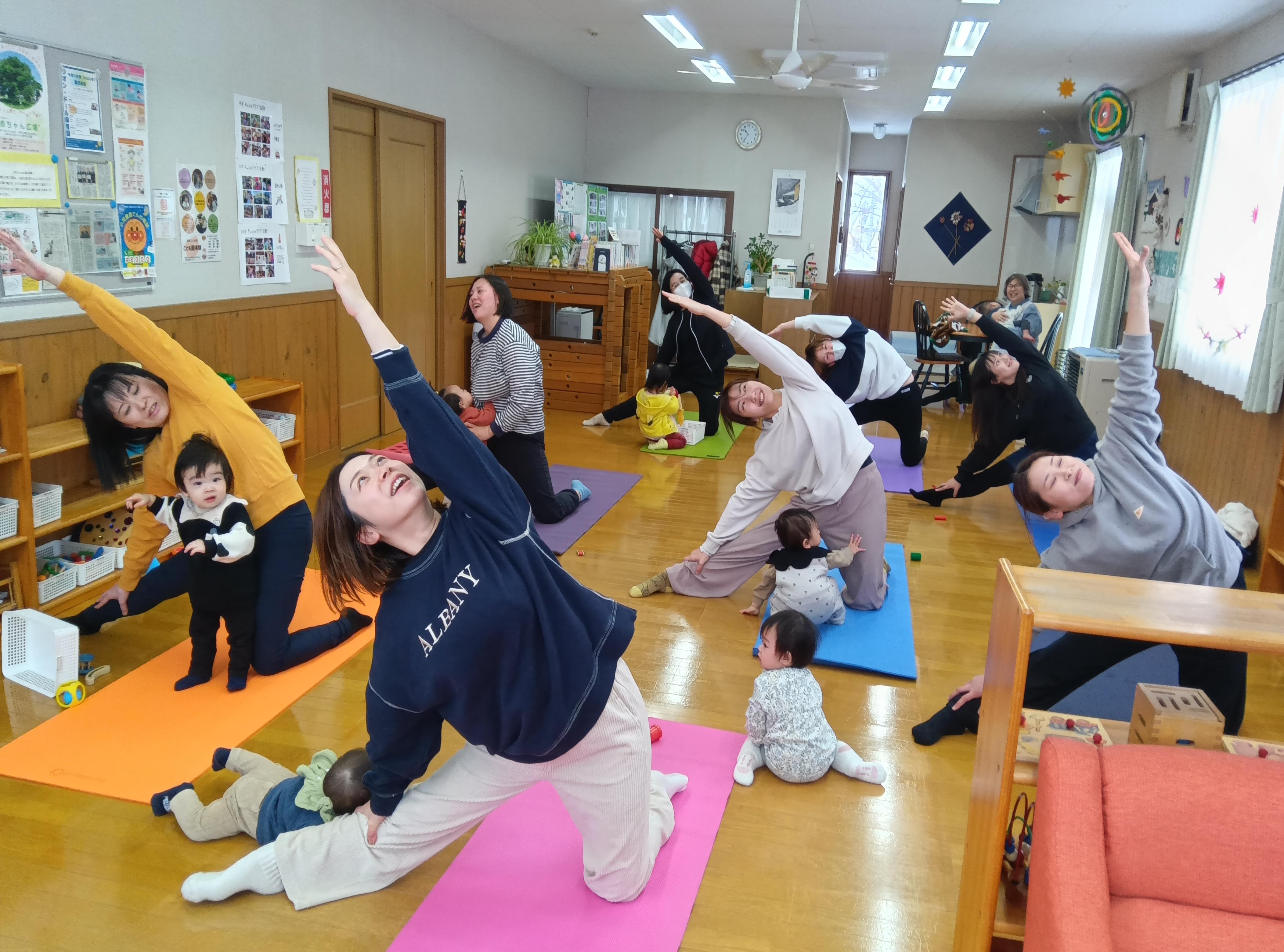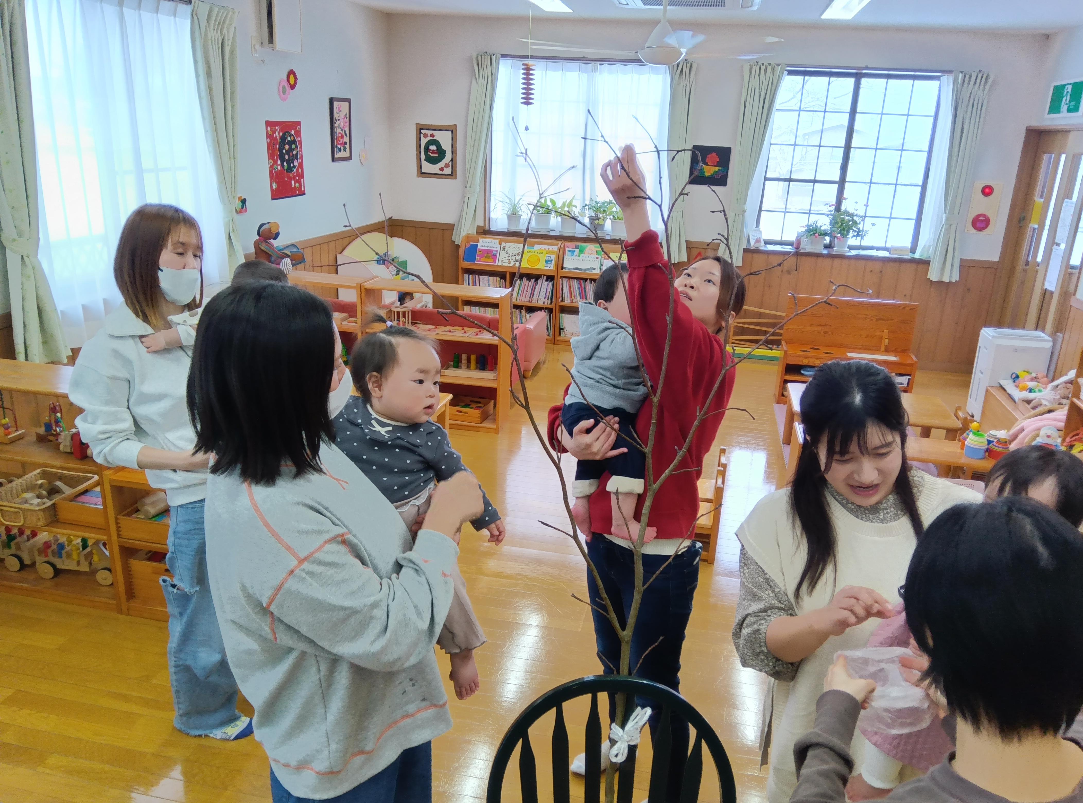 団子さしでは、こどもとお母さんで赤・緑・黄・白の団子を丸め、色鮮やかな団子をみず木に飾りました。一年の健康と豊作を願い飾られたみず木はまるで花が咲いたようでした。育児講座では「ママヨガ」を行いました。こどもはお母さんのそばで応援しているかのように静かに遊ぶ姿が見られたり、お母さんの上に乗ったり、親子でふれあいながら体を動かして心も体もほぐれる時間となりました。